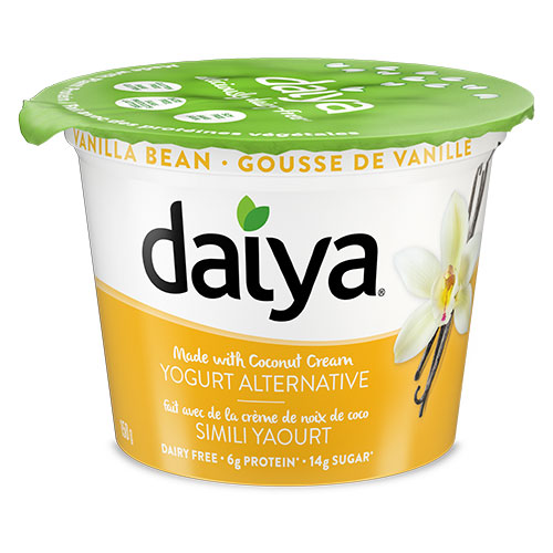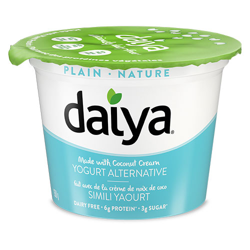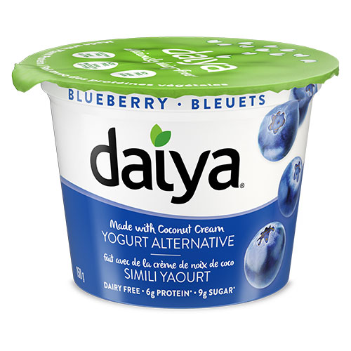 Mornings are a whole lot sweeter with our new dairy-free yogurt alternatives. Afternoons and evenings are too, because our new recipe is made with coconut cream and lightly sweetened with pure cane sugar for an even richer, creamier texture and taste. Each serving provides six grams of plant-based protein. The blueberry, strawberry, black cherry and peach flavours include pieces of real fruit, and all fruit flavors have 50 percent less sugar per serving than the average dairy-free brand. So go ahead. Find a sweet spot in your day with new Daiya Coconut Cream Yogurt Alternatives.